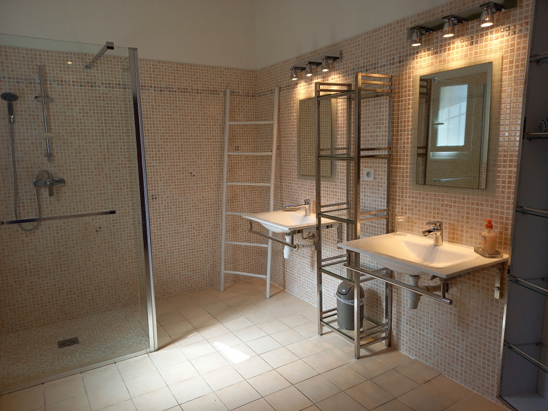 La maison se compose d'un hall entrée desservant une cuisine équipée et sa sortie terrasse couverte, une chambre, une salle de douche et son wc, un petit cellier, un salon séjour cheminée, à l'étage deux chambres, une salle de douche et son wc.